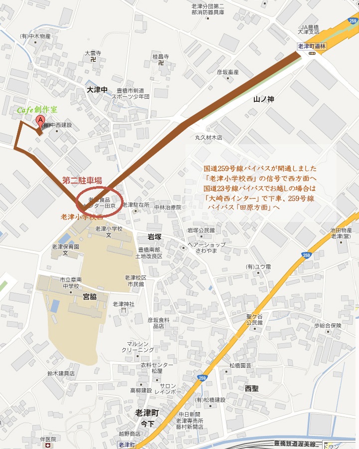 201607/26 CATEGORY:お知らせ 駐車場について 8月の「カフェ創作室」葡萄収穫祭の、ランチお申し込みをありがとうございます。 テーブルが満席となりましたので、ランチのご予約を締め切らせていただきました。(8/2) 尚、ティータイムにお越しのお客さまは、当日の駐車場を下記の場所にお願いいたします。 当日は、カフェ延長道路の駐車場が混いますので ランチご予約の方へは、メールにてご連絡しますが ティタームへお越しいただける方は 259号線の信号機「老津小学校西」の左角「食品センター田京」の駐車場をご利用ください。 259号線下り(至・田原方面)から入ることができます。 時間帯によってはカフェ前の駐車場が空いてることもありますので 当日・原田(080-5115-8439)までお電話ください。