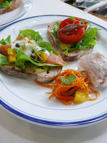 薪窯で焼いたカンパーニュに、リーフレタス・セミドライトマト・ディルとフェンネルの葉でオリーブオイルマリネしたスモークサーモン・スライスオニオン・ケイパーに サッとE.X.V.オリーブオイルをかけて・・・ディルを。