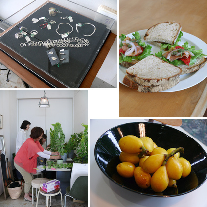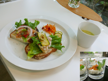 同じカンパーニュに バターとハニーマスタードを塗り、リーフレタス・ズッキーニのピクルス・蒸し鶏をハーブドレッシングで漬けこんだもの・輪切りのグリーンオリーブ・ピンクペッパーに、黒こしょうを挽いて、ブッシュバジルの一枝を添えました。