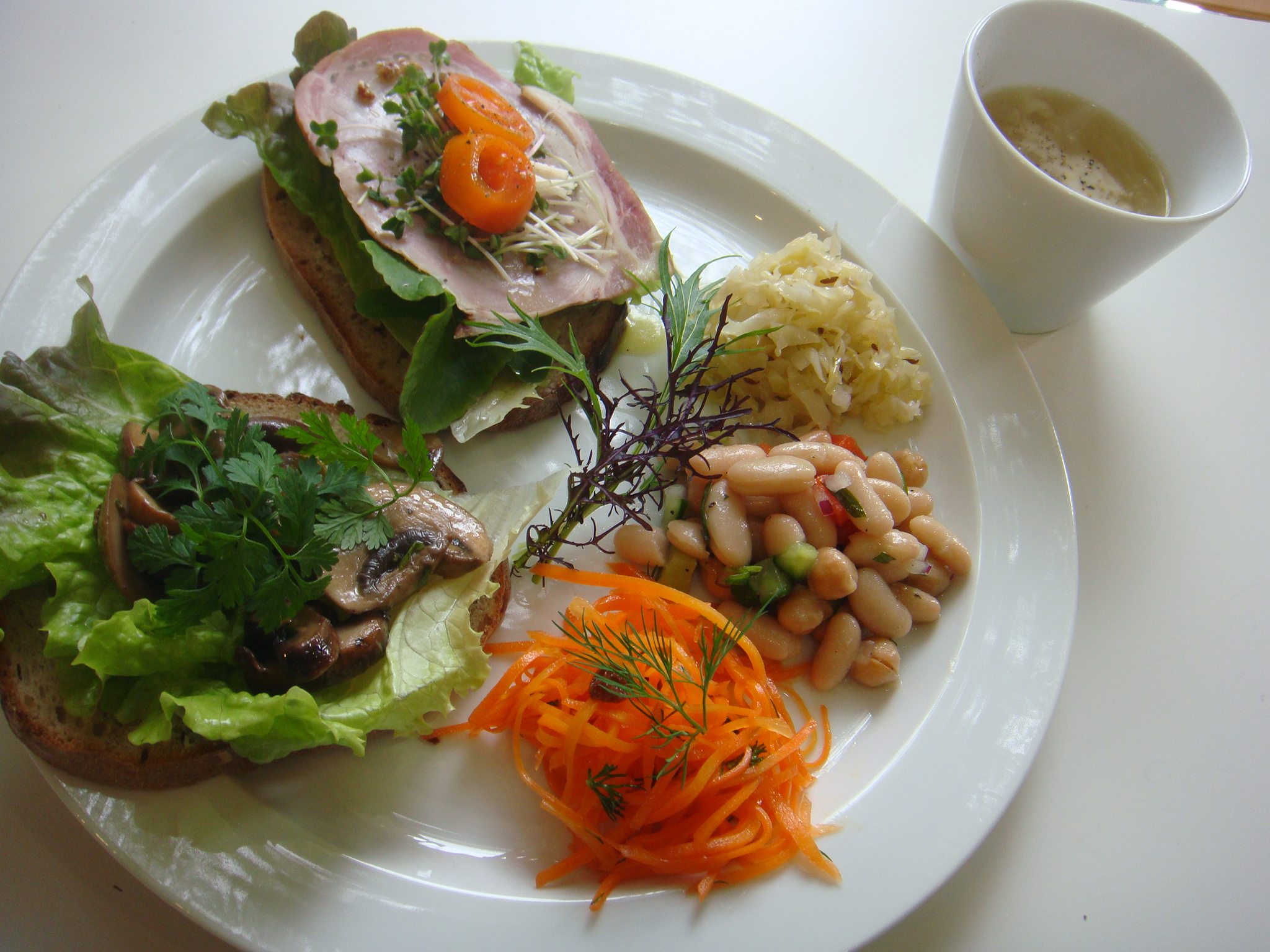 201511/16 CATEGORY:Herbal Kitchen N '15.11 月 ランチメニュー 朝の曇り空から 爽やかな秋晴れに… 暖かな日曜日のカフェになりました〜♪ ご来店の方々 ありがとうございました。 ランチメニュー紹介 ・キャベツとベーコン・ヨーグルトのスープ ・ワンプレート カンパーニュにレタス・ルッコラ :きのこ2種のソテー・バジル風味 ミニトマト :鶏ムネ肉のハム・クレソン・チャービル ビネグレット :白インゲン・エンドウなどのサラダ ディル風味 :キャロットラペ マージョラム風味 :ビーツのピクルス・カブの浅漬け ・アップル ジンジャーブラウニーと食用ほうずき ・ハーブティー :レモングラス・レモンバーベナ ミント・ジンジャー Herbal Kitchen N