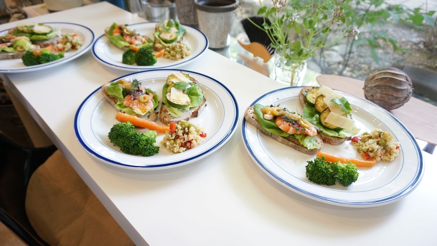 201505/21 CATEGORY:Herbal Kitchen N '15.5 月 ランチメニュー 新緑が濃い緑に変化した中庭に… 爽やかな風が吹き、ゆったりとしたカフェ日和でした。 ご来店の皆様 ありがとうございました〜♪ ランチメニュー紹介 ・ヨーグルト・キュウリのディル風味のスープ ・ワンプレート オープンサンド :サラダ菜・エビ・玉ねぎソース・スプラウト :サラダ菜・ズッキーニのソテー・チーズ ガーニッシュ :キヌア・豆のサラダ ミント風味 :ブロッコリーのペペロンチーノ :キャロット グラッセ・ローズマリー風味 ・デザート :レモンフレイバーゼリー・イチゴ・洋梨 ・ハーブティー :カモミール・ミント・レモングラス・レモンバーベナ Herbal Kitchen N PR