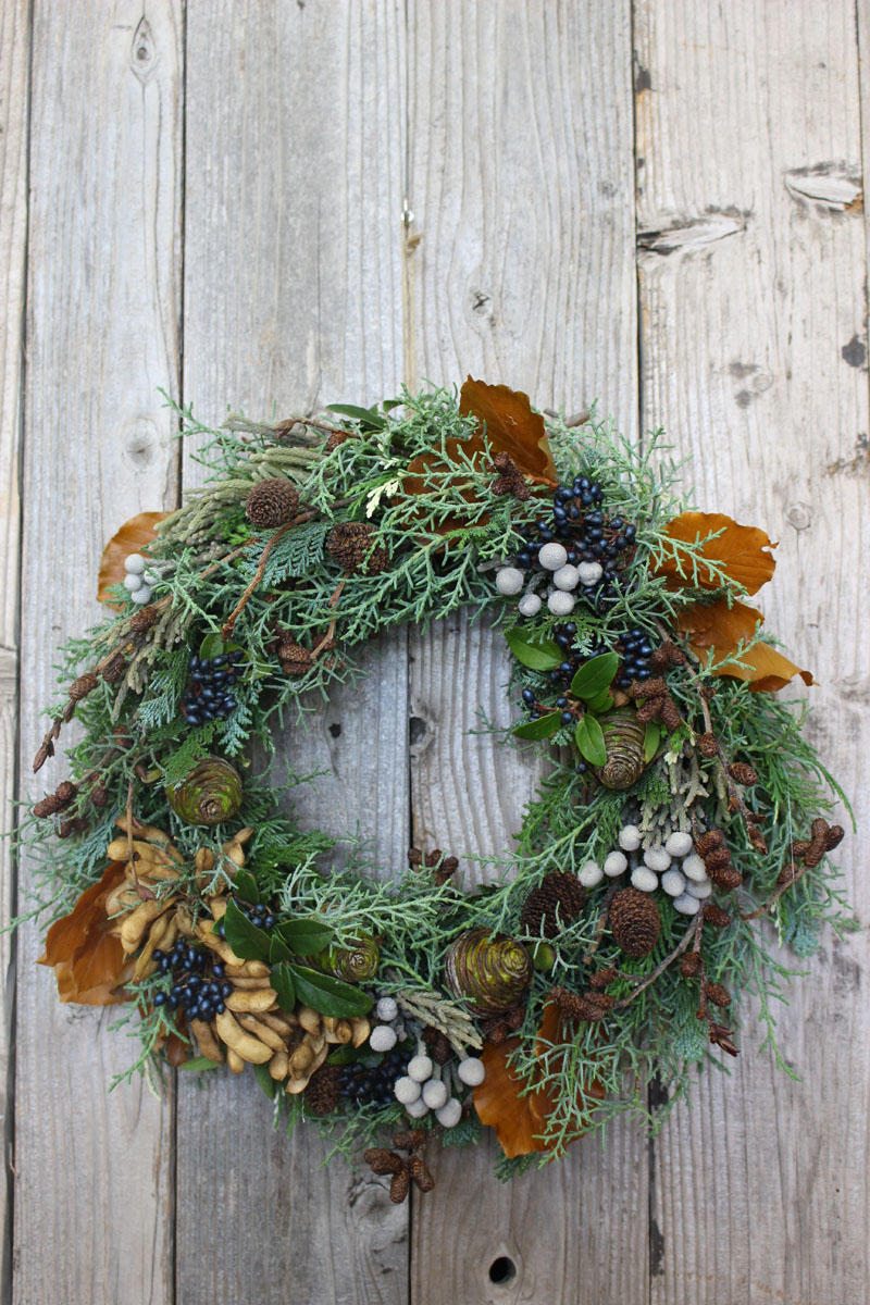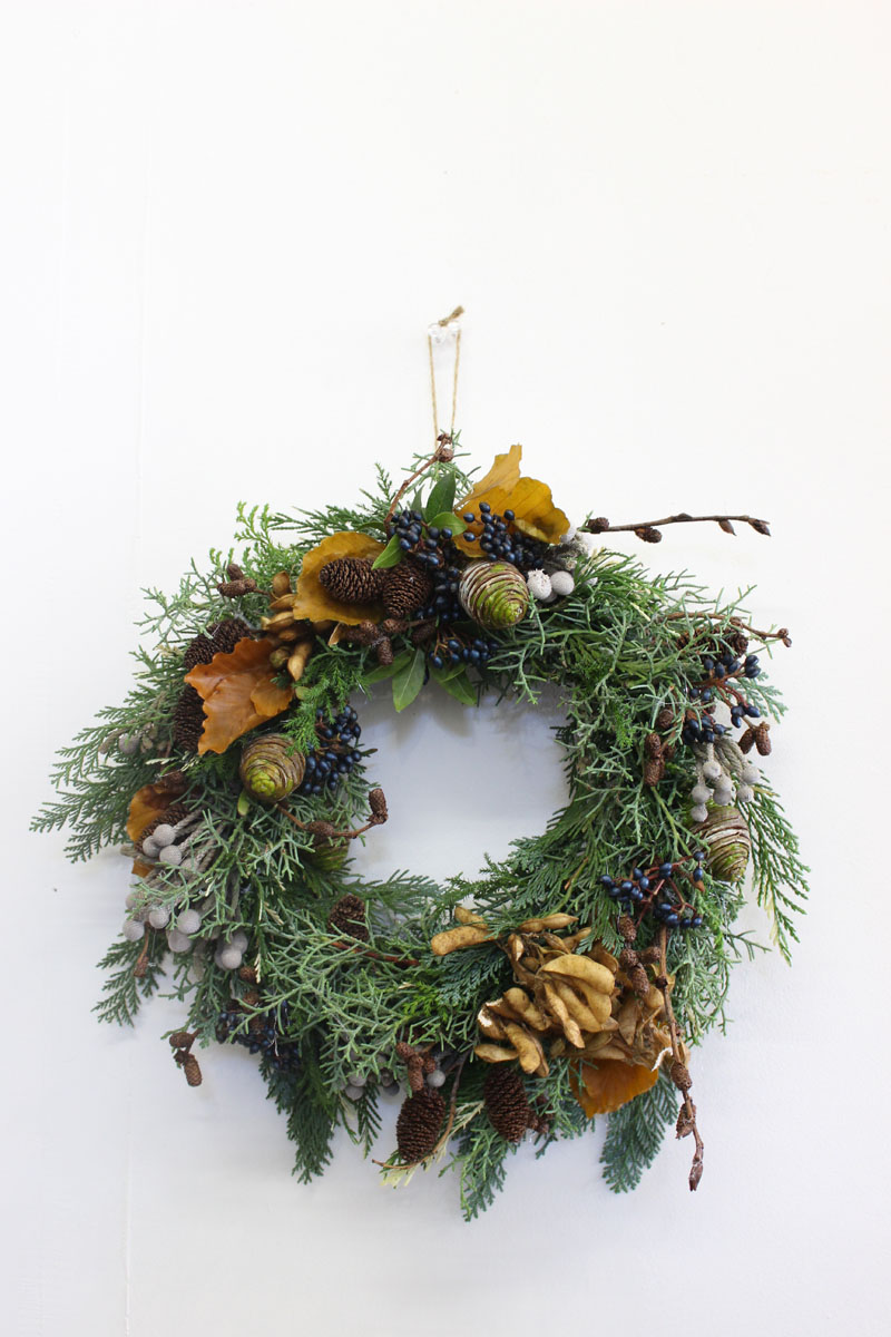 201511/16 CATEGORY:kumin 便り クリスマスリース 11月のレッスンは、毎年恒例のクリスマスリース作りでした。 石化豆、ビバーナムティナス、ヤシャブシ、シルバーブローニア、 プラティスター、ヒバ、ファーガス(西洋ブナ)などを使って お疲れ様でした^^ kumin