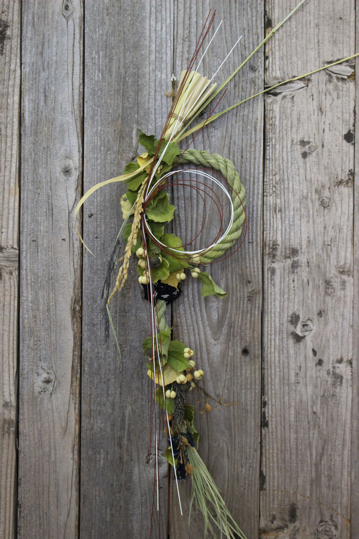 201512/21 CATEGORY:kumin 便り お正月飾り 今年最後のレッスンは、お正月飾りを作りました。 今年収穫して下さった稲でなって頂いたしめ縄を材料に、 ナンキンハゼ、桐の実、アワ、稲穂でデコレーションして頂きました。 デコレーションに藍染の刺し子、綿の柿渋染、綿の帯地、藍の型染めなどの 布をそれぞれ選んで頂き、糸と針で縫っていただきました。 水引と布地で雰囲気が変わり、写真はその1つですが、それぞれが 雰囲気のある作品に仕上がりました。お疲れ様でした。 今年一年、カフェ創作室をお借りしてレッスンできましたこと。 そして、カフェを毎回開いて下さり、楽しいひと時を生徒さんと共に 過ごすことが出来ましたことをありがたく感謝しております。 ありがとうございます。 来年もどうぞ宜しくお願い致します。 あたたかな新年をお迎え下さいませ。 kumin PR